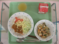 2019年9月19日 13時41分 今月の郷土料理は沖縄料理です。タコライスとマーミナーチャンプルーです。タコライスはメキシコ風アメリカのタコスの食材をごはんの上にのせた料理です。1984年に沖縄県で誕生し、1990年代からは学校給食に採用されました。マーミナーは沖縄方言で「もやし」のことで、マーミナーチャンプルーとはもやしをメインに様々な食材を一緒にして炒めた料理です。
